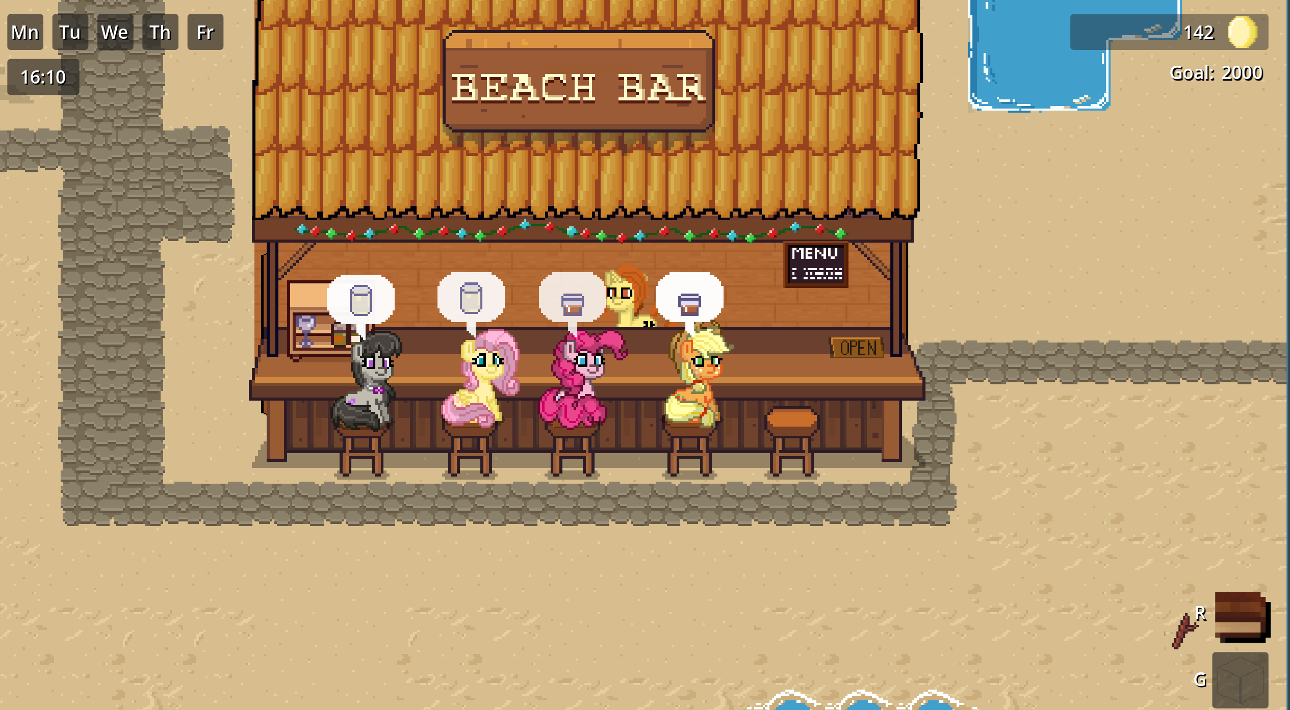 You are playing as pony who likes bartender hobby. Yor just bought a bar near beach and need to earn a rent in 5 days of selling drings to other ponies.
